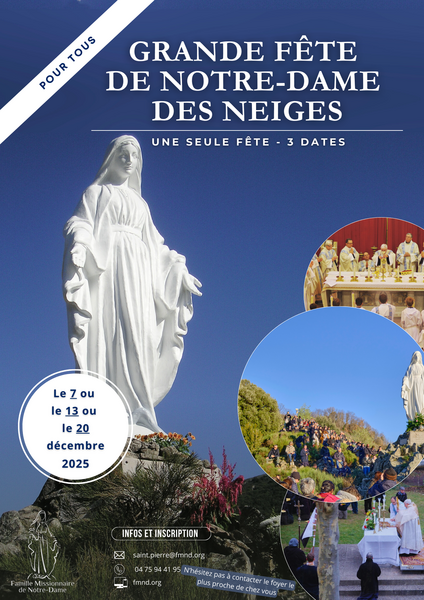 Ponto culminante e fonte de todas as atividades da Família Missionária de Nossa Senhora, a grande festa de Nossa Senhora das Neves reúne todos os anos um grande número de peregrinos de todo o mundo para acolher as grandes graças da sua Mãe do Céu.